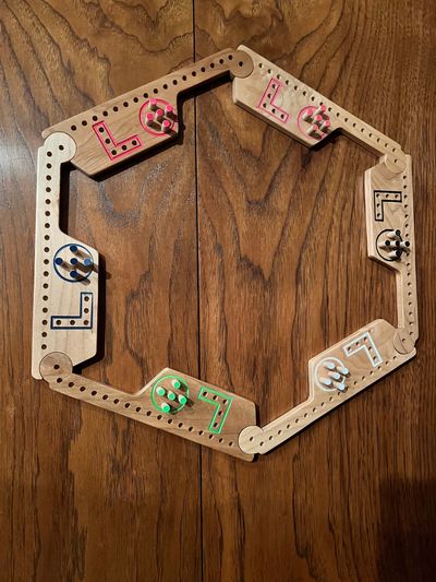 You must use the exact number of spaces to move into HOME (Fig. 2), except when using a 7 or 9. You can not jump over your own peg to move further into HOME. Once a peg is in its HOME position, it is HOME and can’t be bumped. You can not back into HOME. If moving backward, go past HOME, then forward into your HOME on your next turn. When entering the HOME position, if your only move is for more spaces then what’s in HOME, you can not enter HOME and must go around again! When playing in teams, you first must get all your pegs into HOME. Then you can help your teammate on your left. Once all of their pegs are in their HOME, then you help the remaining teammate. First team to have all their pegs in their HOME’s win!!!